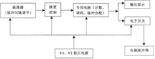 本控制儀由雙時(shí)基電路CH7556的1/2作為無(wú)穩(wěn)態(tài)多諧振蕩器產(chǎn)生周期為1~99秒的可調(diào)脈沖信號(hào);另1/2作為單穩(wěn)態(tài)電路完成計(jì)數(shù)、譯碼、脈沖分配等一系列邏輯功能,再由專用電路的各輸出端輸出所設(shè)定的脈沖寬度信號(hào)至電子開(kāi)關(guān)(VMOS電路),控制電磁脈沖閥的開(kāi)啟,噴吹壓縮空氣,同時(shí)由數(shù)碼管顯示噴吹順序。
