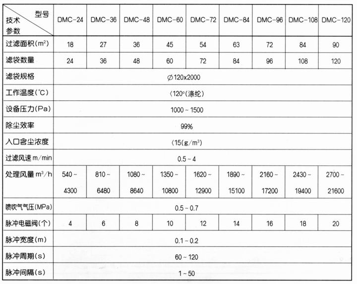 DMC型脈沖袋式倉頂除塵器 DMC型脈沖袋式倉頂除塵器適宜布置在各種粉料貯存庫的頂部,用于捕集各種細小干燥非纖維粉塵。 主要技術參數: DMC型脈沖袋式倉頂除塵器主要技術參數見表,在選型時應注意入口粉塵濃度,在技術性能上,透過濾袋的氣流速度(即過濾風