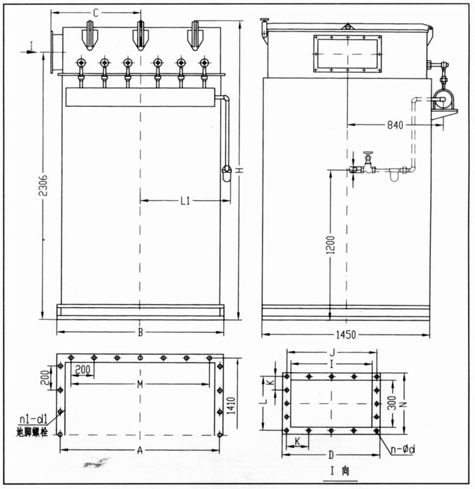 DMC型脈沖袋式倉頂除塵器主要技術參數見表,在選型時應注意入口粉塵濃度,在技術性能上,透過濾袋的氣流速度(即過濾風速)與氣體含塵濃度成反比,因此在確定過濾面積時,還須滿足濾袋的聚塵能力(即兩次清灰期間濾袋單位面積上最大允許積塵數量),一般聚塵能力不大于400克/m2,可按下式計算: