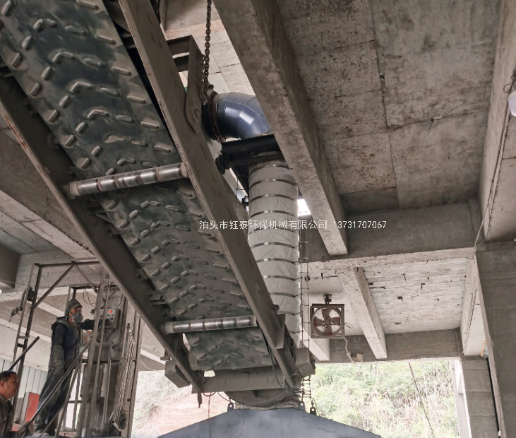 根據(jù)袋水泥裝車(chē)機(jī)生產(chǎn)工藝要求,需要膠帶機(jī)前后運(yùn)行,設(shè)計(jì)在移動(dòng)膠帶機(jī)車(chē)的尾部安裝一臺(tái)固定收塵集箱,集箱一側(cè)出口連接500mmX500mm可伸縮移動(dòng)管道,一般可移動(dòng)伸縮8m長(zhǎng)度,把可移動(dòng)吸塵罩收集的粉塵氣體通過(guò)此移動(dòng)管路輸送到固定管路,再由固定管路將粉塵氣體輸送到除塵器內(nèi)進(jìn)行凈化處理,移動(dòng)管路內(nèi)部安裝多個(gè)滾輪軸承,每節(jié)移動(dòng)管路上都設(shè)有法蘭油浸羊毛氈做為密封,可滿足袋水泥裝車(chē)機(jī)前后移動(dòng)運(yùn)行的要求。